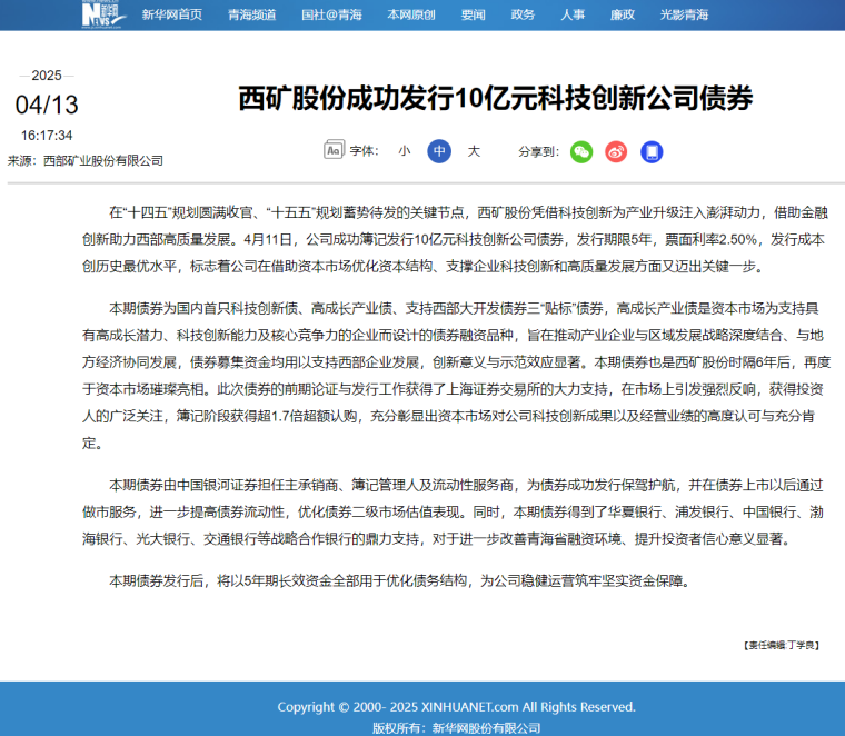 在“十四五”规划圆满收官、“十五五”规划蓄势待发的关键节点,西矿股份凭借科技创新为产业升级注入澎湃动力,借助金融创新助力西部高质量发展。4月11日,公司成功簿记发行10亿元科技创新公司债券,发行期限5年,票面利率2.50%,发行成本创历史最优水平,标志着公司在借助资本市场优化资本结构、支撑企业科技创新和高质量发展方面又迈出关键一步。