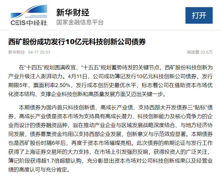 在“十四五”规划圆满收官、“十五五”规划蓄势待发的关键节点,西矿股份科技创新为产业升级注入澎湃动力。4月11日,公司成功簿记发行10亿元科技创新公司债券,发行期限5年,票面利率2.50%,发行成本创历史最优水平,标志着公司在借助资本市场优化资本结构、支撑企业科技创新和高质量发展方面又迈出关键一步。